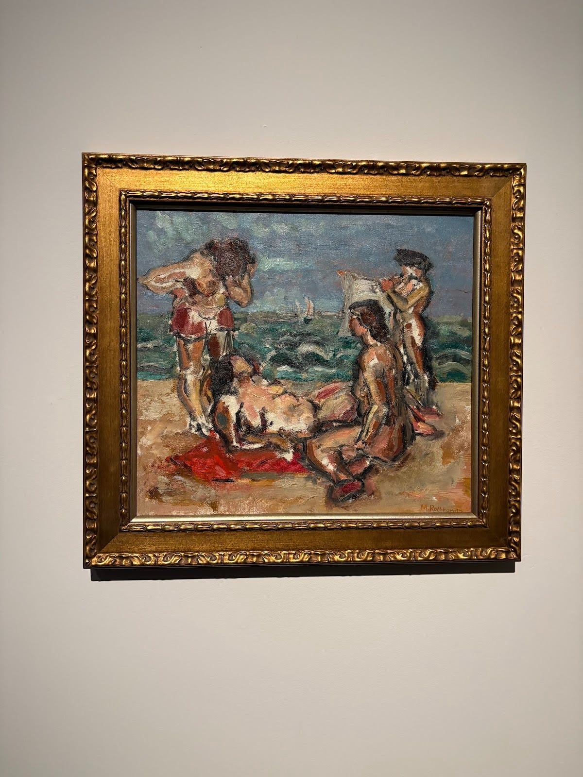As part of its grand reopening, PAM is currently showing some of Rothko’s early work, which he created while apprenticing under Milton Avery. One of the early paintings is a beach scene featuring four sunbathers, three of whom are apparently nude. It’s figurative and representational. It has lines. It has a fucking sailboat. It’s a world away from the big color blocks of his later career, a few of which hang on the opposite wall.