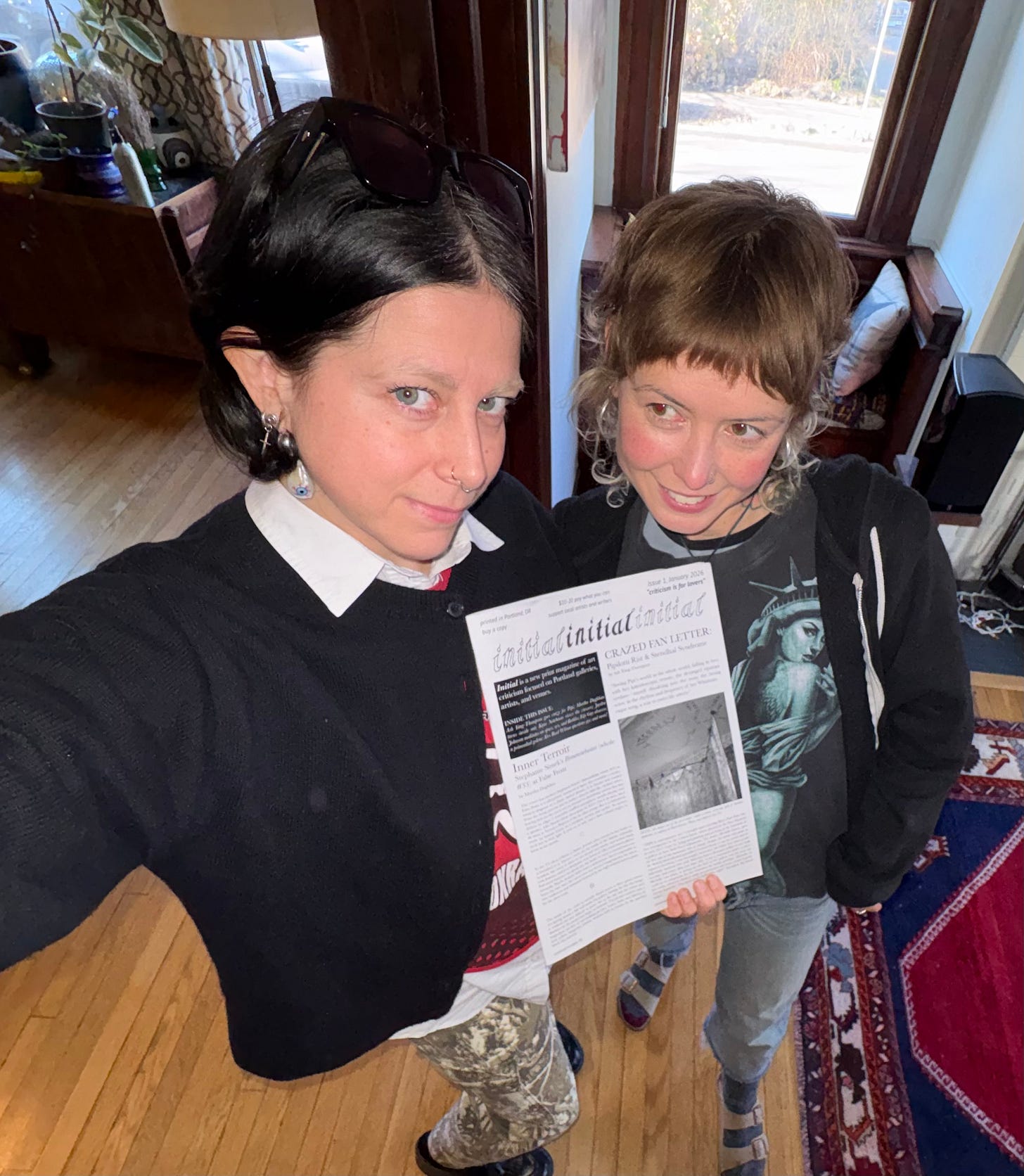 Below is an excerpt from the essay I wrote for Initial, the magazine of Portland-focused arts writing I started with pal Martha. Here is us with the print proof: