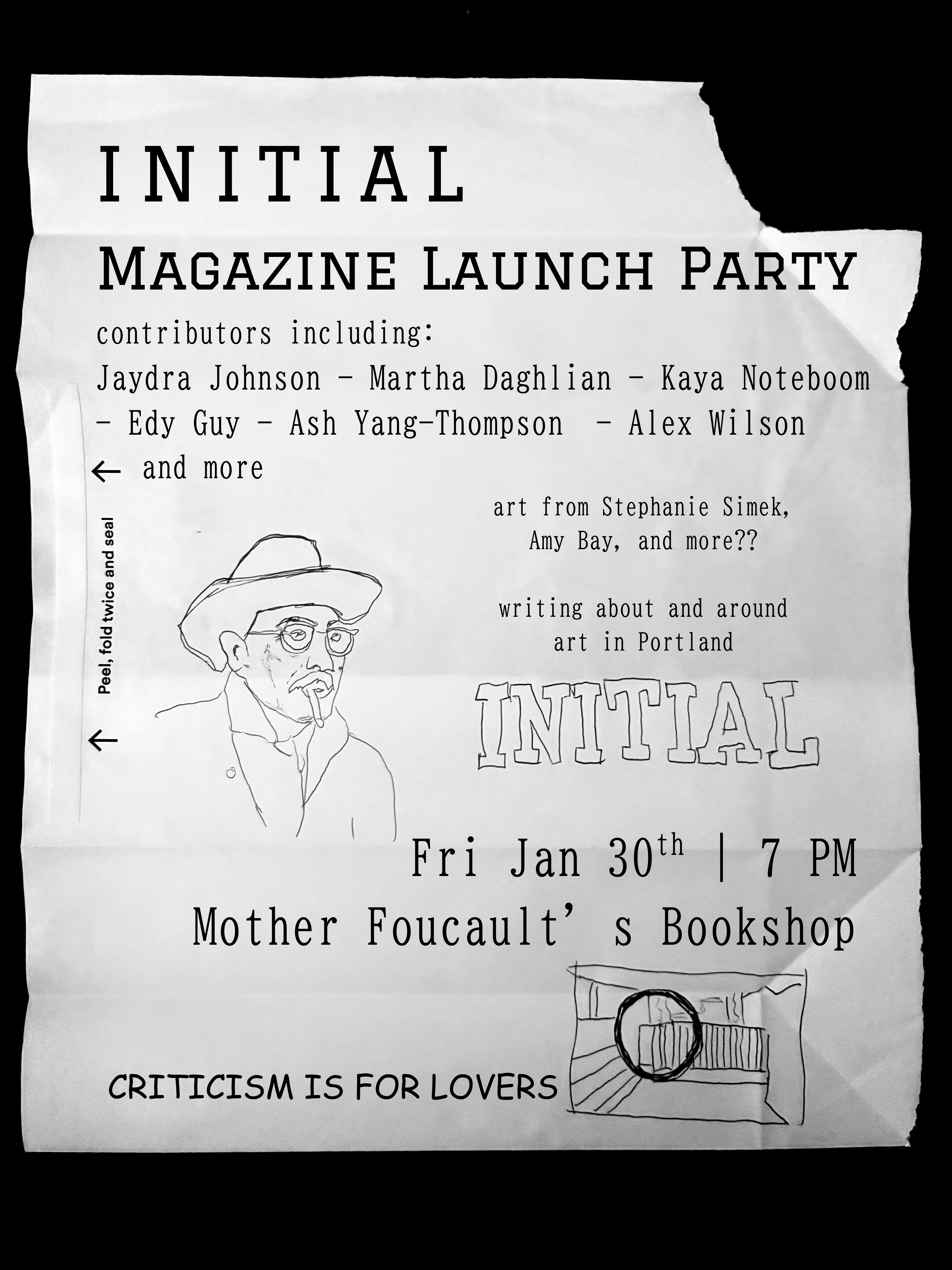 Initial will have a website, but we hope the magazine will be a tool to further connect the local arts community. To that end, attending an event or visiting a stockist (MF’s, Nationale, others TBD) in person to purchase will be strongly encouraged for those who are able. Formal information about ways for out-of-towners to purchase the mag are forthcoming, but for now you can Venmo me with your preferred shipping name and address in the comment field. Issues are $10-20 pay what you can. Media mail postage is, what, $1.50?